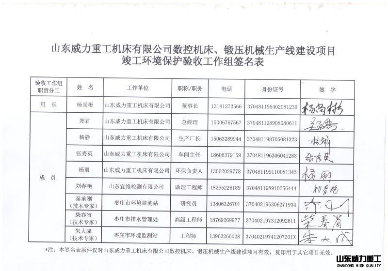 2018 年 6 月 10 日,山東威力重工機床有限公司在滕州市經(jīng)濟(jì)開發(fā)區(qū)組織召開“山東威力重工機床有限公司數(shù)控機床、鍛壓機械生產(chǎn)線建設(shè)”項目竣工環(huán)境保護(hù)驗收會,參加會議的有:驗收監(jiān)測報告編制機構(gòu)—山東宜維檢測有限公司的代表和三名專業(yè)技術(shù)專家,會議成立了驗收工作組(成員名單附后)。